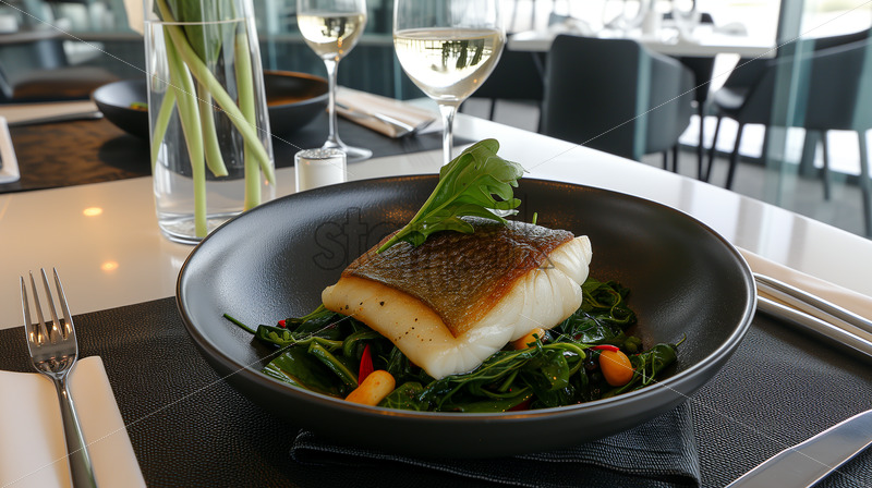 Pan-seared fillet on sautéed greens with lemon myrtle sauce, set in a modern Australian restaurant.