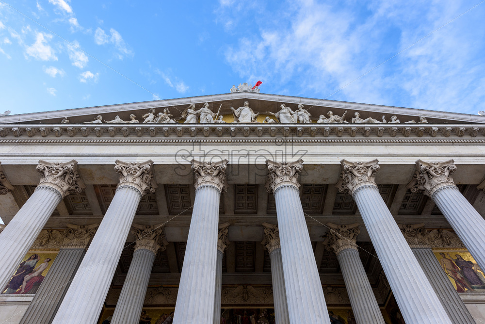 Roman statue at historic building of the Austrian parliament in Vienna, on ringstrasse street, Austria, sunny day and blue sky