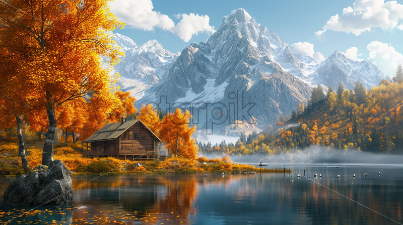 Autumn in the mountainous area next to a river, and among the trees there is a wooden cabin