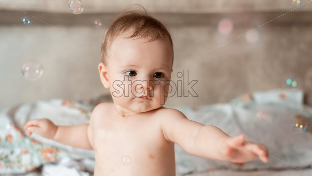 Caucasian blonde baby boy on a bed, playing with soap bubbles flying around