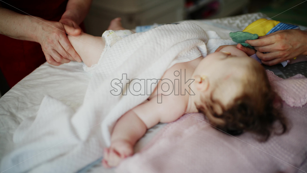 Mother gently wrapping a baby in a soft blanket during a massage and care session