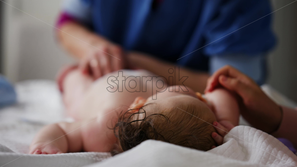 Baby lying on their back while an adult massages them and the mother gently holds the baby’s hand