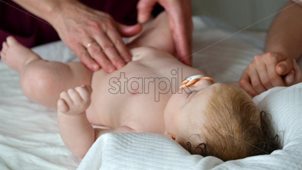 Baby lying on their back while an adult massages them and the mother holds the pacifier in the baby’s mouth