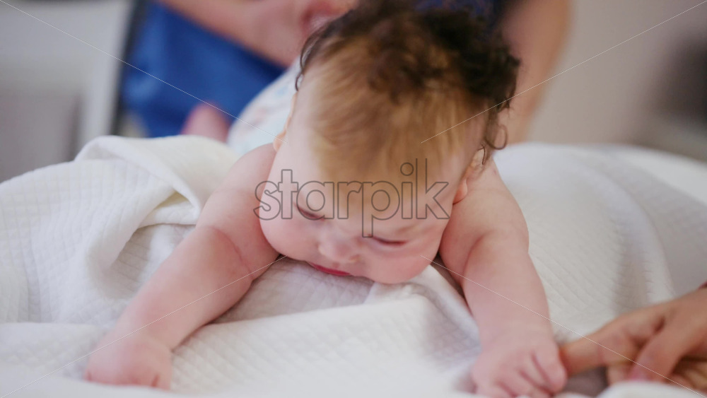 Home » Shop » 1 Video » Baby lying on their tummy while an adult massages them and performs mobility exercises