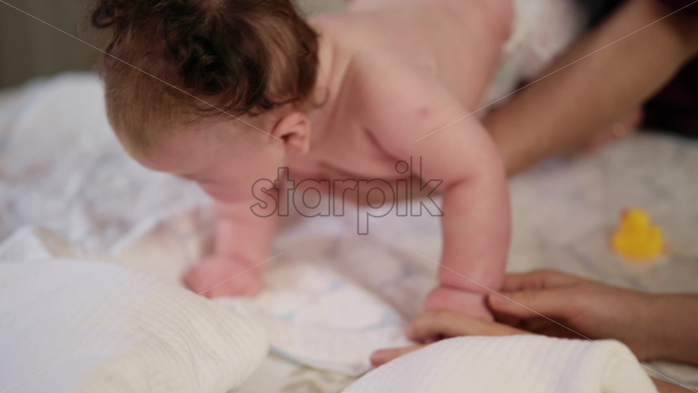 Home » Shop » 1 Video » Baby lying on their tummy while an adult massages them and performs mobility exercises