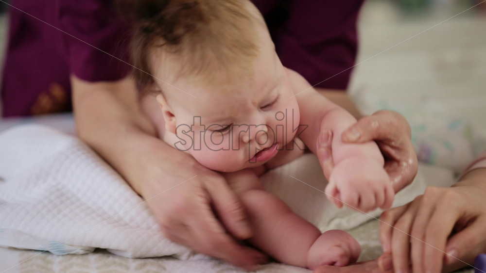 Home » Shop » 1 Video » Baby lying on their tummy while an adult massages them and performs mobility exercises