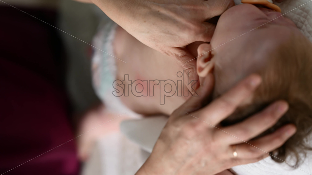Home » Shop » 1 Video » Baby lying on their tummy while an adult massages them and performs mobility exercises