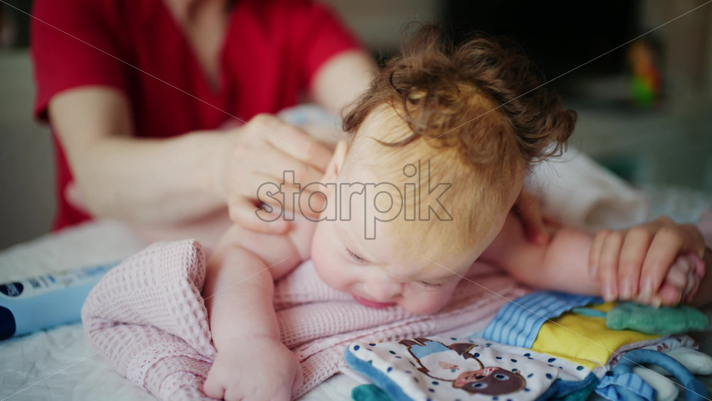 Close up of a baby while an adult gently supports them during a home care routine