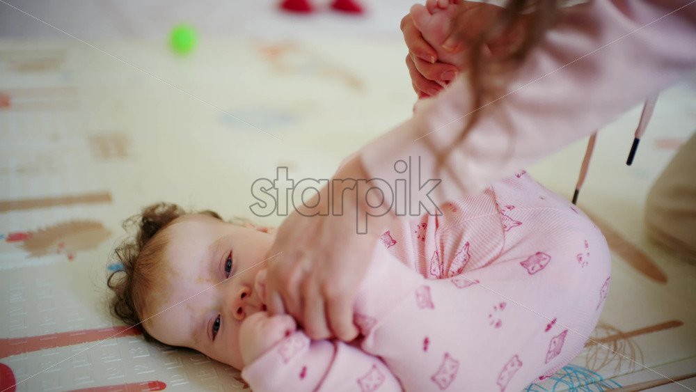 Caregiver holding the baby’s arm upright to support movement
