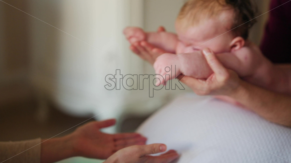 Baby placed on a stability ball while adults support the infant’s body