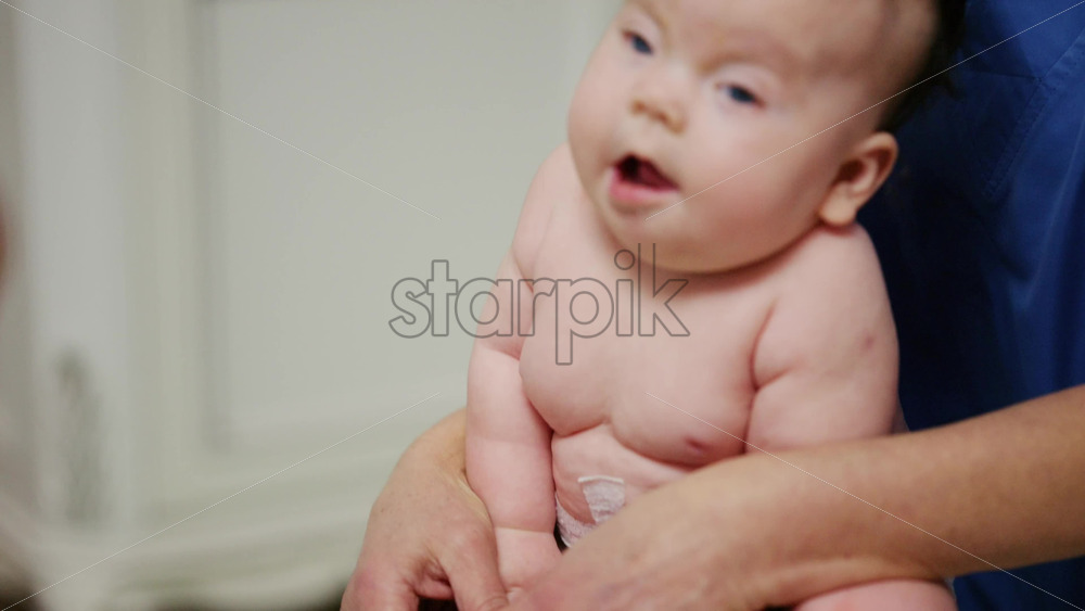 Baby placed on a stability ball while adults support the infant’s body