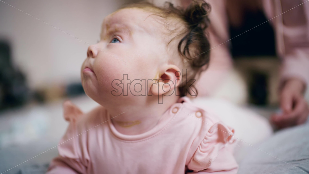 Infant raising head while supported on tummy, strengthening neck muscles during early development