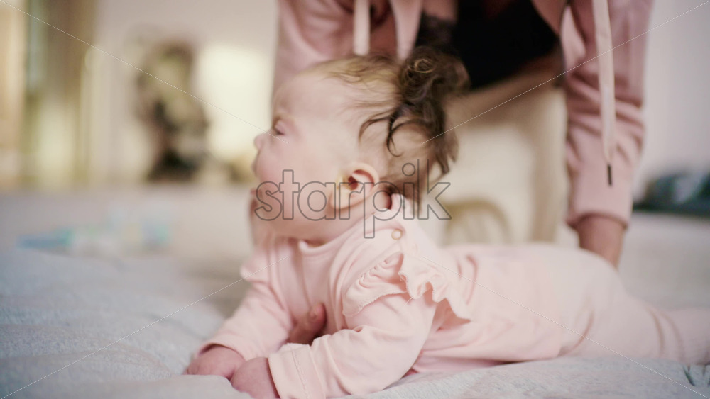 Infant practicing tummy time on a padded surface while a caregiver gently supports the baby’s back Royalty Free Stock Video Footage