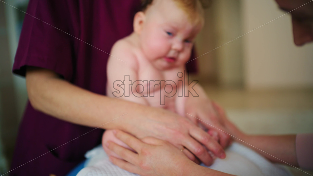 Caregiver lifting a baby upright while turning the infant’s head