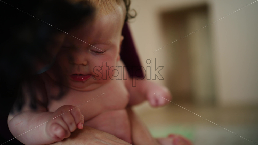 Infant raising head while supported on tummy, strengthening neck muscles during early development