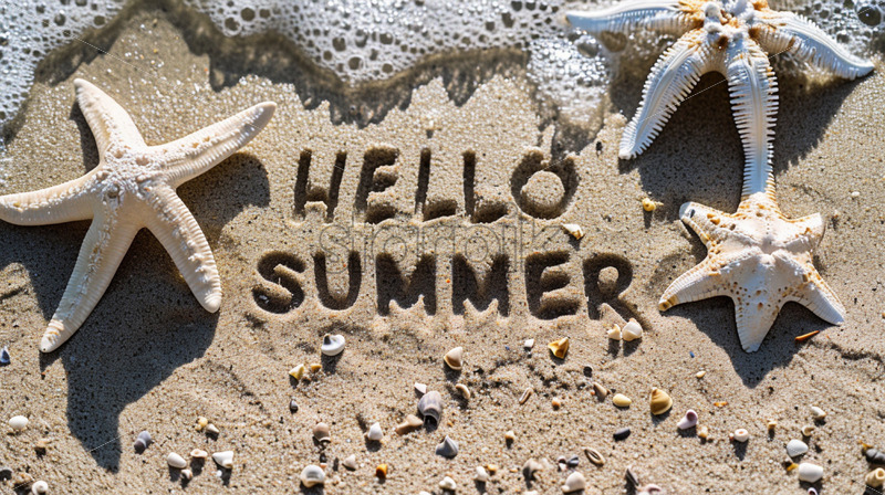 Background of sand and sea, text HELLO SUMMER is drawn in the sand