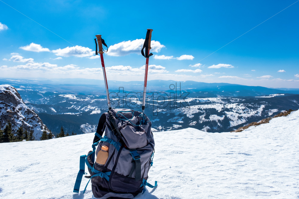 winter landscape in the mountains of Sinaia in a sunny day, a woman skiing, Romania