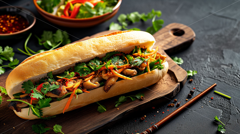 Vietnamese Bánh Mì, a flavorful sandwich with various fillings, gracefully presented on a rustic wooden board.