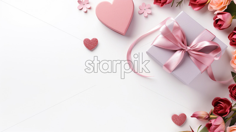 Banner with gift box and spring flowers on isolated white background