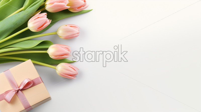 Banner with gift box and spring flowers on isolated white background