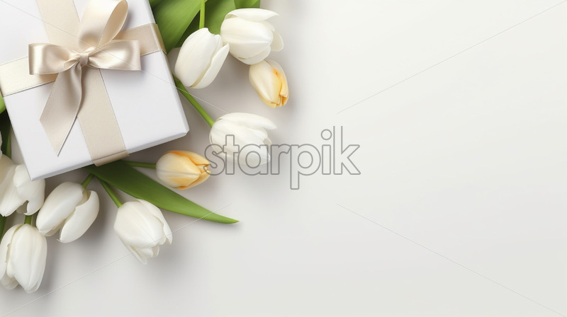 Home » Shop » Uncategorised » Banner with gift box and spring flowers on isolated white background