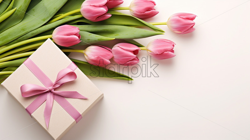 Banner with gift box and spring flowers on isolated white background