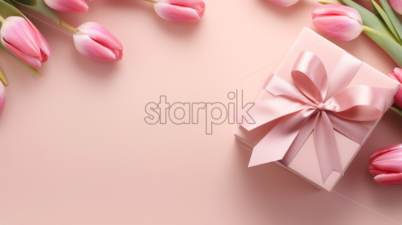 Top view giftbox with gold ribbon bow and yellow tulips on isolated white background