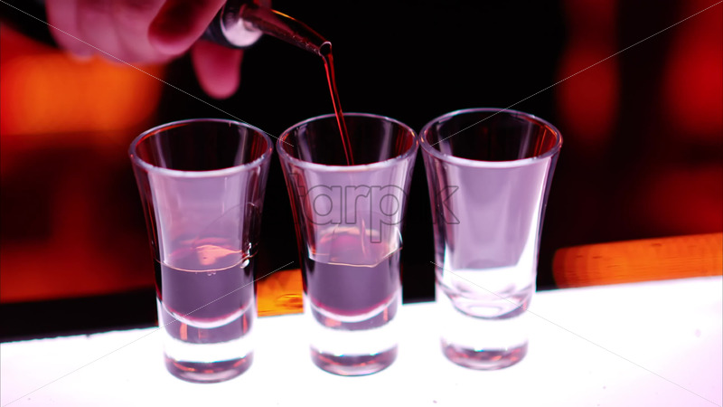 Barman making cocktail shots with liquor alcohol in three layers at the bar at night with red neon lights, slow motion Download royalty free stock video footage Royalty Free Stock Video Footage