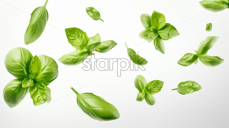 Basil leaves floating in the air on a white background