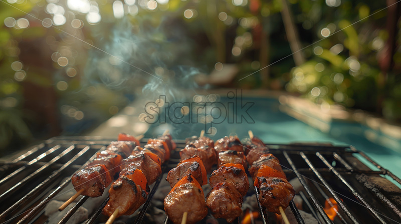 A poolside barbecue party with sizzling grills, delicious aromas, and casual summer vibes