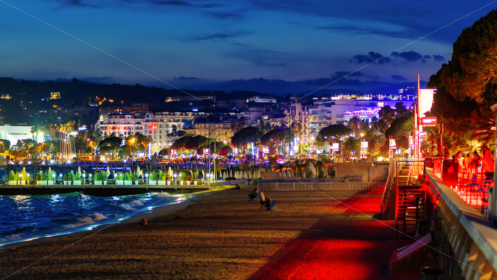 CANNES, FRANCE – SEPTEMBER 11, 2021: Beach with people at night, coastline, nightlights, rows of buildings