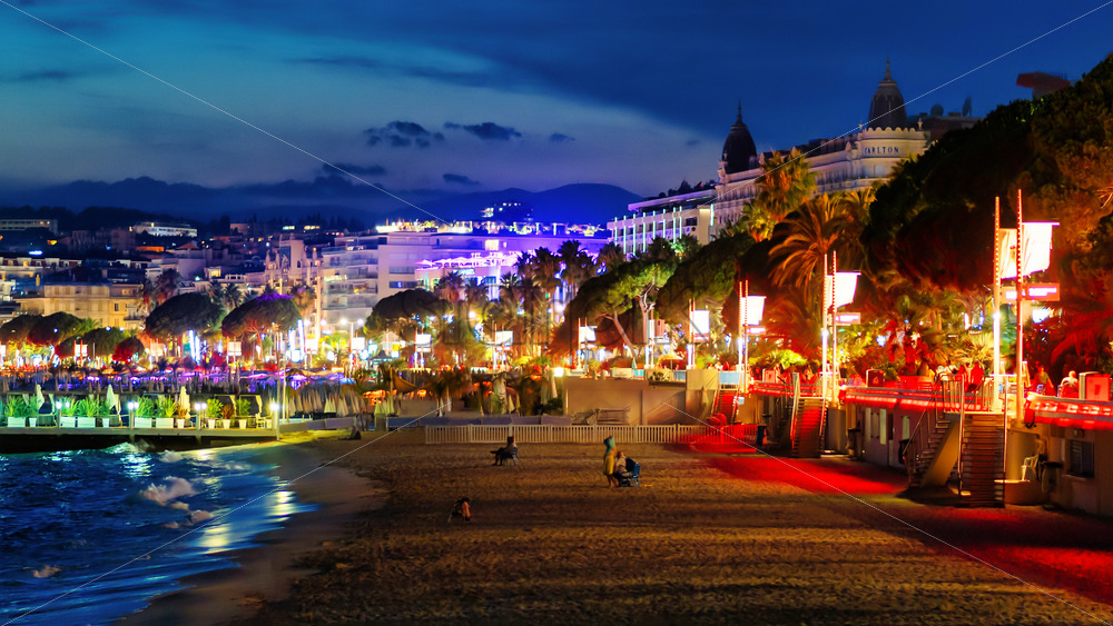 CANNES, FRANCE – SEPTEMBER 11, 2021: Beach with people at night, coastline, nightlights, rows of buildings