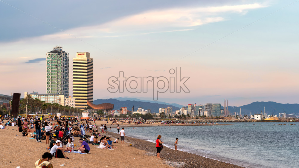 BARCELONA, SPAIN – JUNE 9, 2021: Beach on Mediterranean sea coast at sunset. Multiple people, hotel and palms