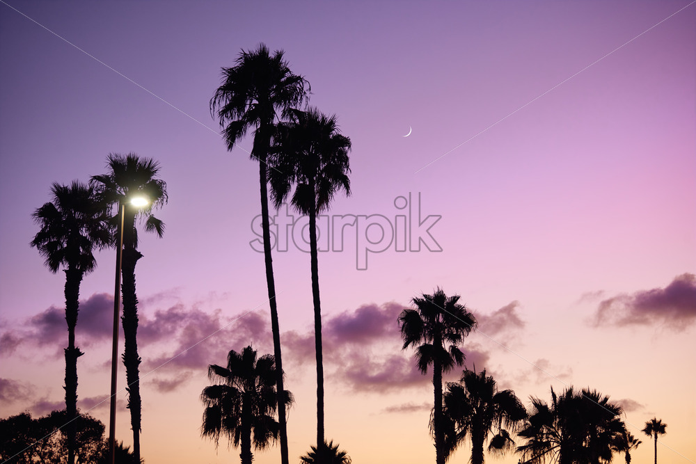 Beach with palm trees silhouette and purple sky on background. San Diego, California
