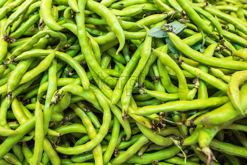 Beans for sale at the local marketplace in Valencia, Spain. Green vegetables