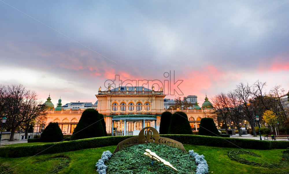 Beautiful bright red sunset view to Stadtpark Garden in cloudy day, green clock. Vienna, Austria
