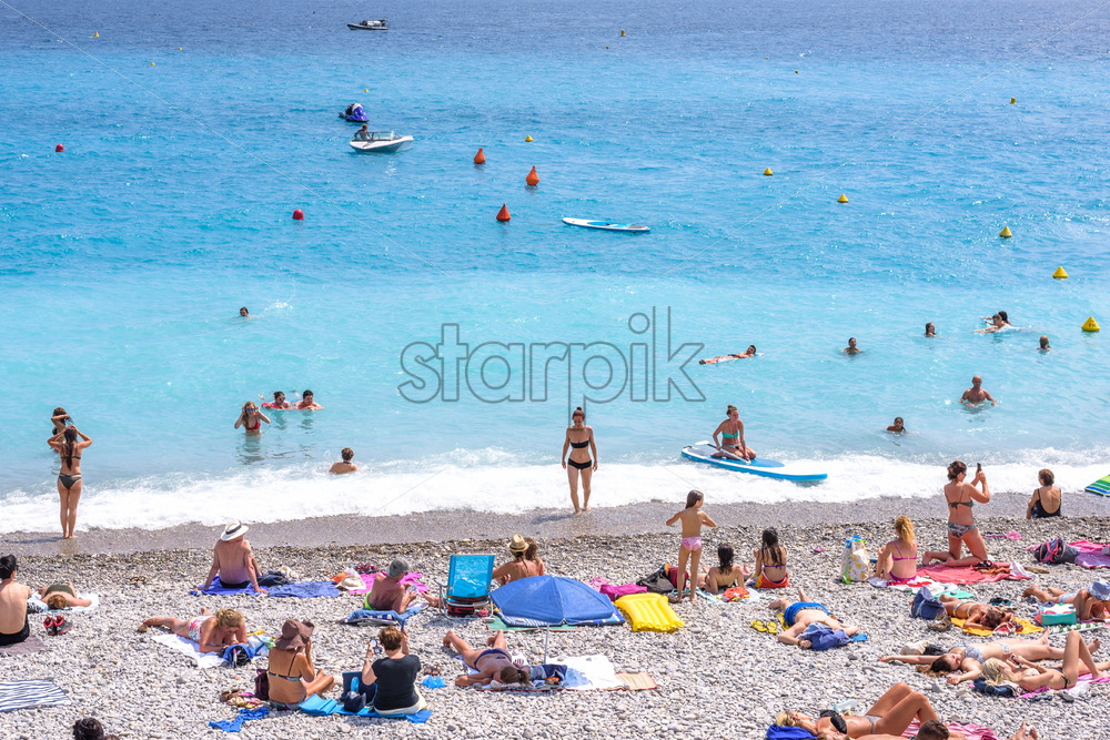NICE COTE D’AZUR, FRANCE – JUNE 27,2017: Beautiful daylight view to city beach. Blue water with people walking on sand.