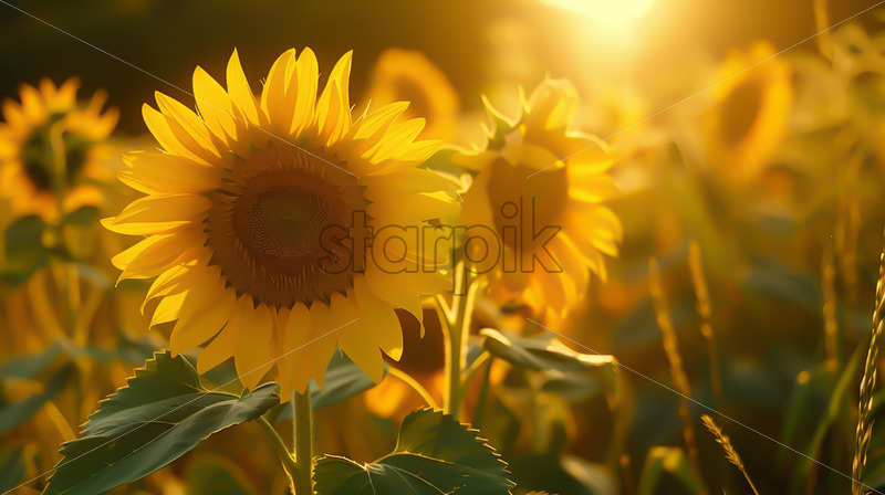 A field full of flowers at sunrise, the fog in the distance