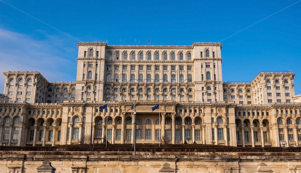 Aerial drone view of Bucharest, Romania. City downtown with Palace of the Parliament, People’s Salvation Cathedral, greenery and other buildings around