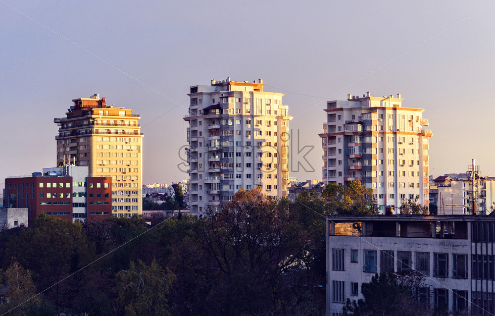 Home » Shop » photo » Beautiful sunset in Chisinau town. Warm light reflecting on buildings. Purple blue sky on background. Negative copy space, place for text. Moldova beauties
