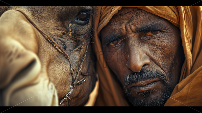 A close-up portrait captures the Bedouin nomad’s dignified strength, highlighting the endurance of desert life.