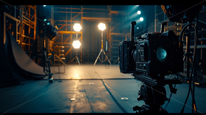 Cameraman spinning focus wheel on a professional camera while filming a television talk show. Video production backstage in a dark studio Royalty Free Stock Video Footage