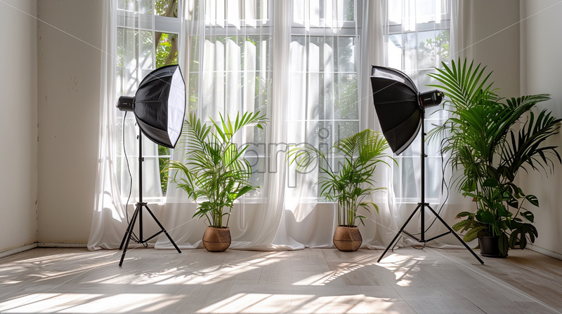 Behind the scenes of a theatre scene with curtains and lights preparing for a show