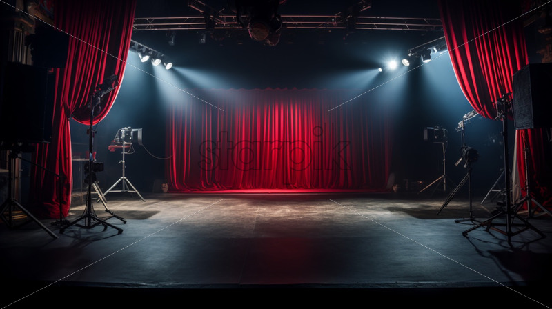 Behind the scenes of a theatre red curtains and lights