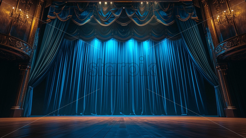 Behind the scenes of a theatre scene with curtains and lights preparing for a show