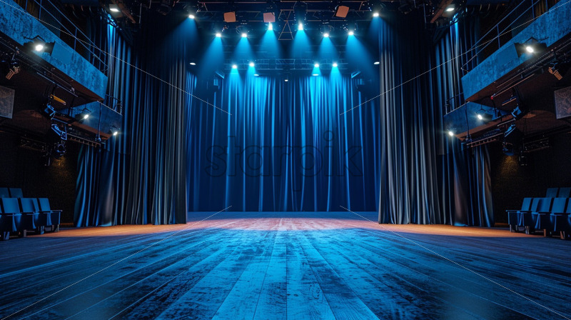Behind the scenes of a theatre scene with curtains and lights preparing for a show