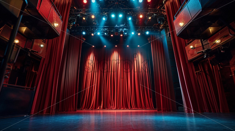Behind the scenes of a theatre scene with curtains and lights preparing for a show