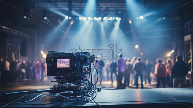 Behind the scenes of a theatre scene with curtains and lights preparing for a show