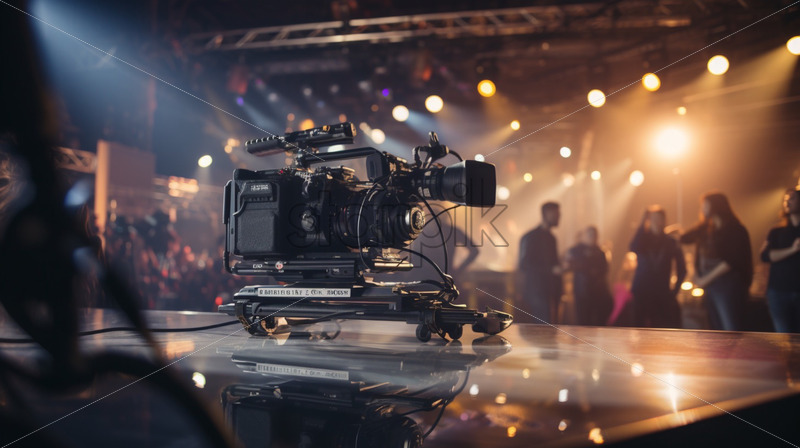 Behind the scenes of a theatre scene with curtains and lights preparing for a show