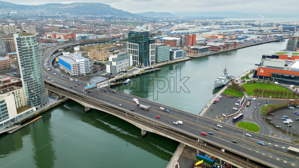 Belfast, Ireland – March 7, 2025: Aerial drone view of cars driving over the Queen Elizabeth II Bridge, over the River Lagan Royalty Free Stock Video Footage